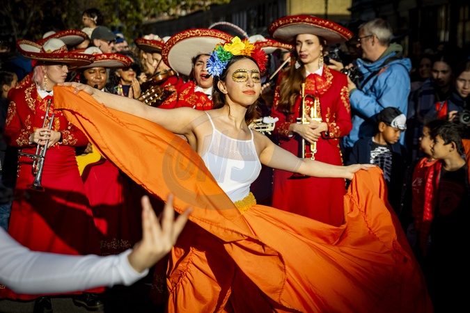 The Day of the Dead celebration took place at Columbia Road Flower Market in East London, with vibrant processions winding through the market's stalls. The event featured altars, floral displays and traditional music as locals and visitors gathered to honour ancestors and celebrate heritage amid the iconic flower market setting., Credit:Zak Irfan / Avalon