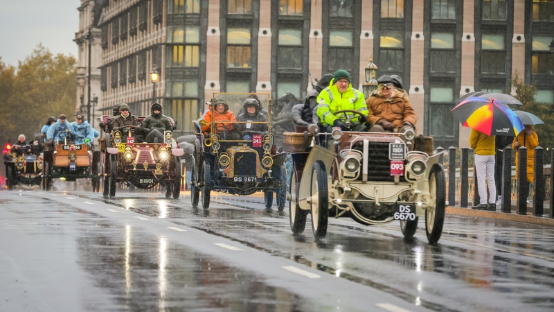 London, UK. 02nd Nov, 2025. Participating pre-1905 veteran cars struggle against the heavy morning rain on Westminster Bridge. The London to Brighton Veteran Car Run, one of the longest-running motoring events globally, sets off at Hyde Park and continues through Westminster before the motors make their journey to Brighton. More than 400 ‘horseless carriages' take part this year., Credit:Imageplotter / Avalon