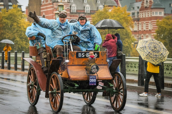 London, UK. 02nd Nov, 2025. Participating pre-1905 veteran cars struggle against the heavy morning rain on Westminster Bridge. The London to Brighton Veteran Car Run, one of the longest-running motoring events globally, sets off at Hyde Park and continues through Westminster before the motors make their journey to Brighton. More than 400 ‘horseless carriages' take part this year., Credit:Imageplotter / Avalon
