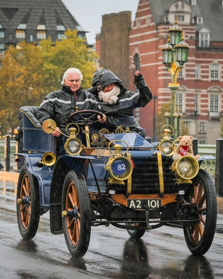 London, UK. 02nd Nov, 2025. Participating pre-1905 veteran cars struggle against the heavy morning rain on Westminster Bridge. The London to Brighton Veteran Car Run, one of the longest-running motoring events globally, sets off at Hyde Park and continues through Westminster before the motors make their journey to Brighton. More than 400 ‘horseless carriages' take part this year., Credit:Imageplotter / Avalon