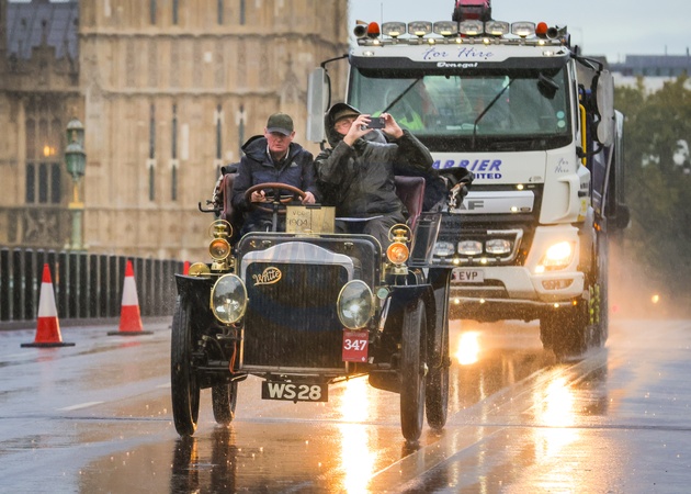 London, UK. 02nd Nov, 2025. Participating pre-1905 veteran cars struggle against the heavy morning rain on Westminster Bridge. The London to Brighton Veteran Car Run, one of the longest-running motoring events globally, sets off at Hyde Park and continues through Westminster before the motors make their journey to Brighton. More than 400 ‘horseless carriages' take part this year., Credit:Imageplotter / Avalon