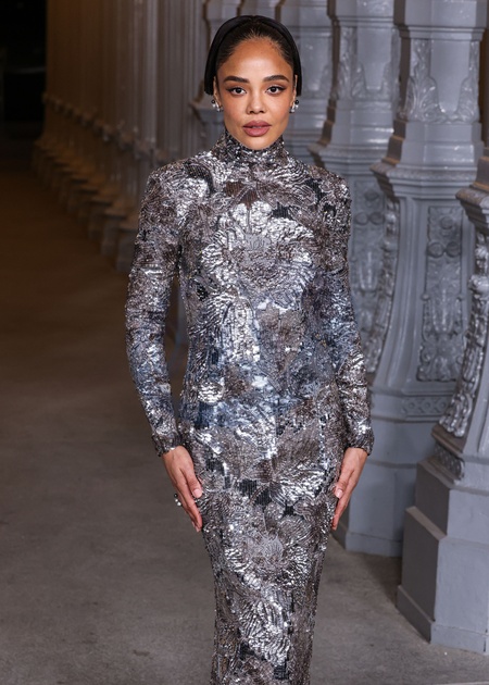MUSEUM ROW, MIRACLE MILE, LOS ANGELES, CALIFORNIA, USA - NOVEMBER 01: Tessa Thompson wearing Gucci arrives at the 14th Annual LACMA (Los Angeles County Museum of Art) Art + Film Gala 2025 presented by Gucci held at the Los Angeles County Museum of Art on November 1, 2025 in Museum Row, Miracle Mile, Los Angeles, California, United States., Credit:Xavier Collin / Avalon