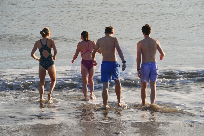 People head out to swim in the sea on a cold but sunny day by the coast., Credit:Geoffrey Swaine / Avalon