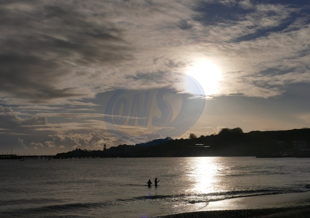 People head out to swim in the sea on a cold but sunny day by the coast., Credit:Geoffrey Swaine / Avalon