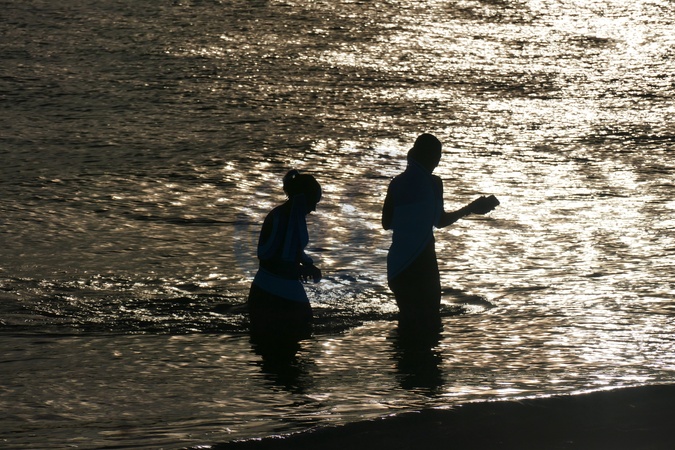 People head out to swim in the sea on a cold but sunny day by the coast., Credit:Geoffrey Swaine / Avalon