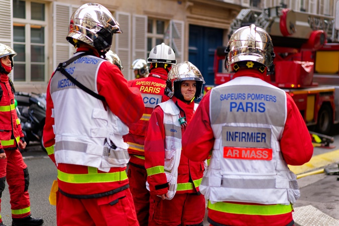Rue Du Mont Thabor, Paris. Paris Fire Brigade.Fire in a building which was quickly extinguished by the Paris Fire Brigade (French: Brigade des sapeurs-pompiers de Paris, BSPP)., Credit:Aldo Ciarrocchi / Avalon