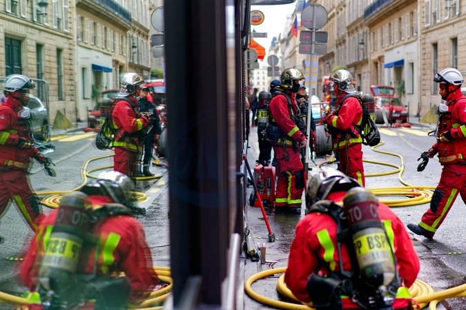 Rue Du Mont Thabor, Paris. Paris Fire Brigade.Fire in a building which was quickly extinguished by the Paris Fire Brigade (French: Brigade des sapeurs-pompiers de Paris, BSPP)., Credit:Aldo Ciarrocchi / Avalon