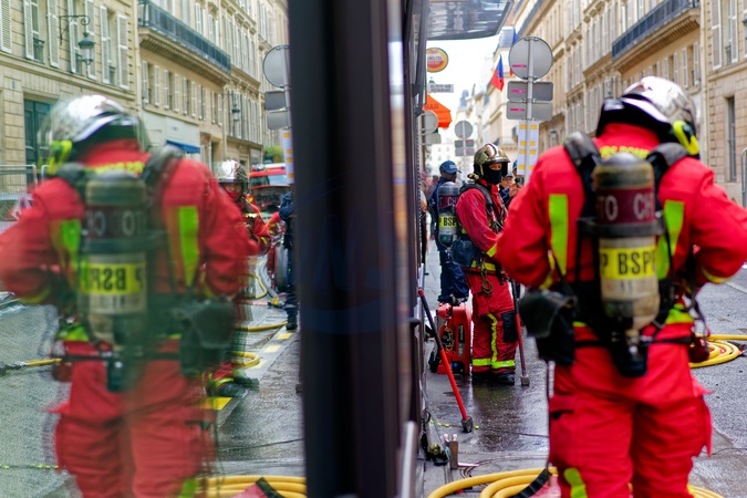 Rue Du Mont Thabor, Paris. Paris Fire Brigade.Fire in a building which was quickly extinguished by the Paris Fire Brigade (French: Brigade des sapeurs-pompiers de Paris, BSPP)., Credit:Aldo Ciarrocchi / Avalon