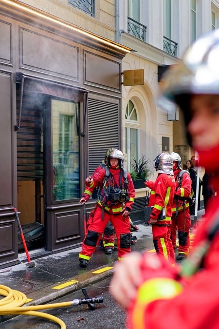 Rue Du Mont Thabor, Paris. Paris Fire Brigade.Fire in a building which was quickly extinguished by the Paris Fire Brigade (French: Brigade des sapeurs-pompiers de Paris, BSPP)., Credit:Aldo Ciarrocchi / Avalon