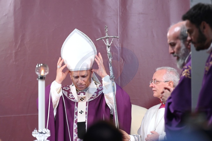 02/11/2025 Roma. Celebrazione della Messa per i defunti al Cimitero del Verano. Nella foto Francis Prevost, Papa Leone XIV chiede aiuto con il bastone pastorale per sistemare la mitra, Credit:Maria Laura Antonelli / Avalon