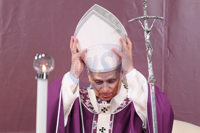 02/11/2025 Roma. Celebrazione della Messa per i defunti al Cimitero del Verano. Nella foto Francis Prevost, Papa Leone XIV chiede aiuto con il bastone pastorale per sistemare la mitra, Credit:Maria Laura Antonelli / Avalon