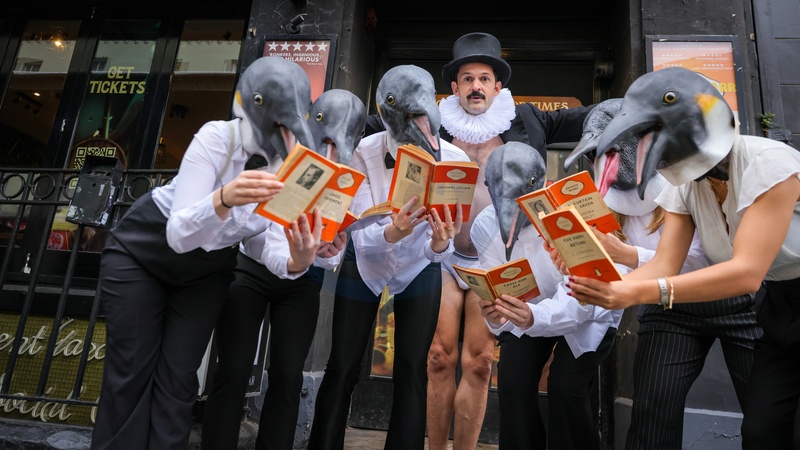 London, UK. 03rd Nov, 2025. Penguin enthusiast and comedian Garry Starr (actor and writer Damien Warren-Smith) hosts his Penguin Book Club, bringing together 9 cute, larger than life penguins in Soho in a bid to save Penguin Classics from extinction ahead of his hit show 'Garry Starr: Classic Penguins' at the West End's Arts Theatre this November and December., Credit:Imageplotter / Avalon