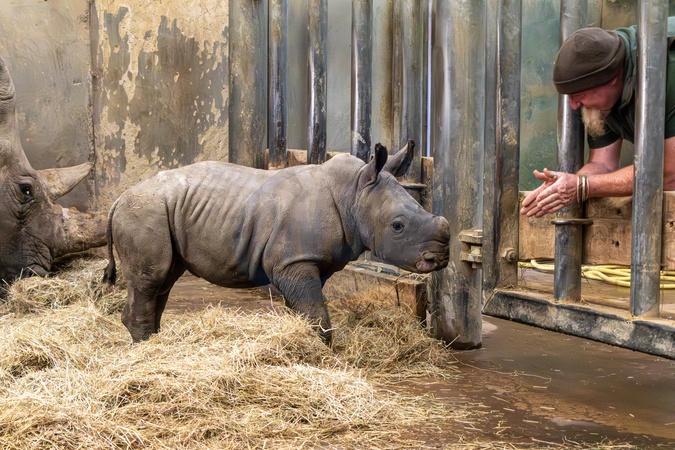 Markus is the newest addition to the Rhino family at Cotswold Wildlife Park and Gardens. He is the twelfth Rhino calf to be born at the Burford collection in twelve years – a tremendous achievement. Births in captivity are extremely rare. In fact, the Park is responsible for the UK's only White Rhino birth this year. In total, just five White Rhinos were born in European zoological collections in 2025. The youngster is healthy and nursing well from Nancy - an exceptional and attentive mother. This is her seventh calf with breeding male Monty. Markus in the Rhino House with Head Keeper Mark Godwin, Credit:Philip Joyce / Avalon