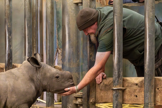 Markus is the newest addition to the Rhino family at Cotswold Wildlife Park and Gardens. He is the twelfth Rhino calf to be born at the Burford collection in twelve years – a tremendous achievement. Births in captivity are extremely rare. In fact, the Park is responsible for the UK's only White Rhino birth this year. In total, just five White Rhinos were born in European zoological collections in 2025. The youngster is healthy and nursing well from Nancy - an exceptional and attentive mother. This is her seventh calf with breeding male Monty. Markus with Head Keeper Mark Godwin in the Rhino House, Credit:Philip Joyce / Avalon