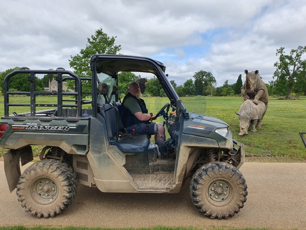 Markus is the newest addition to the Rhino family at Cotswold Wildlife Park and Gardens. He is the twelfth Rhino calf to be born at the Burford collection in twelve years – a tremendous achievement. Births in captivity are extremely rare. In fact, the Park is responsible for the UK's only White Rhino birth this year. In total, just five White Rhinos were born in European zoological collections in 2025. The youngster is healthy and nursing well from Nancy - an exceptional and attentive mother. This is her seventh calf with breeding male Monty. Monty and Nancy mating in spring 2024 (with Head Keeper Mark in the foreground), Credit:Cotswold Wildlife Park / Avalon