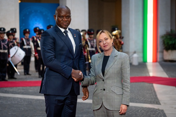 Italian Prime Minister Giorgia Meloni receives the President of the Gabonese Republic, Brice Clotaire Oligui Nguema at Palazzo Chigi in Rome, Italy on 03 November 2025.