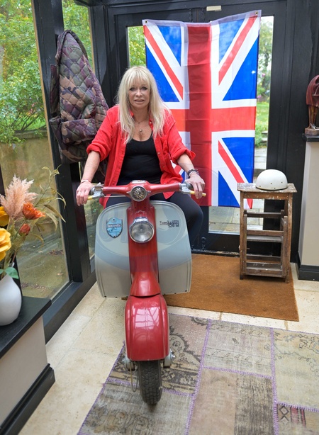 Jo Wood at her home for photoshoot to celebrate her becoming an Ambassador for Homeopathy UK. Northampton, Northamptonshire, UK., Chats In The Kitchen, Recently appointed Homeopathy UK Ambassador Jo Wood spends the day with CEO Monica Price brainstorming about the future of homeopathy., Seen here on the Lambretta her for 18th Birthday, Credit:Jules Annan / Avalon