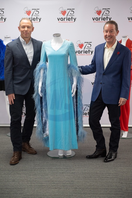 (L) - Laurence Guinness - Chief Executive of Variety and (R) - Robert Willis (son of Cilla Black) pose with a 'Jean Varon / John Bates: A maxi dress / evening gown (late 1960)' est (£350 - £550) worn by Cilla Black during a Royal Variety Performance held on, 10th November 1969. at a photocall for 'The Cilla Black Collection' which is to go on auction for Variety, The Children's Charity on Friday 28th November 2025 at Variety House in London, England, UK on Wednesday 5 November, 2025., Credit:Justin Ng / Avalon
