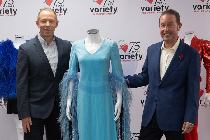 (L) - Laurence Guinness - Chief Executive of Variety and (R) - Robert Willis (son of Cilla Black) pose with a 'Jean Varon / John Bates: A maxi dress / evening gown (late 1960)' est (£350 - £550) worn by Cilla Black during a Royal Variety Performance held on, 10th November 1969. at a photocall for 'The Cilla Black Collection' which is to go on auction for Variety, The Children's Charity on Friday 28th November 2025 at Variety House in London, England, UK on Wednesday 5 November, 2025., Credit:Justin Ng / Avalon
