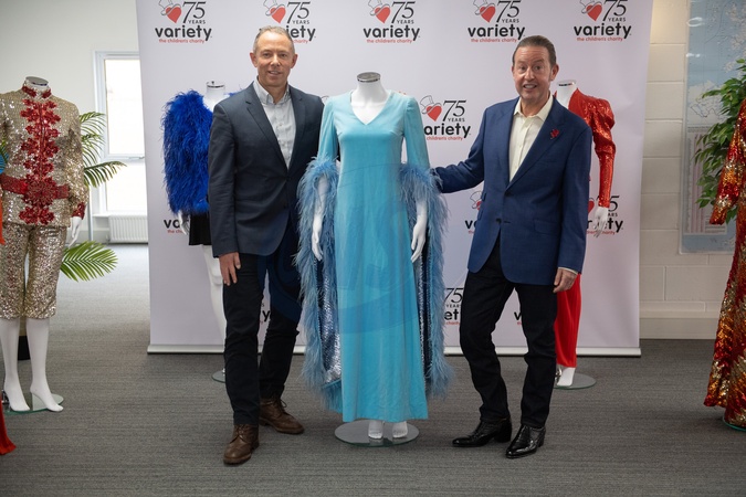 (L) - Laurence Guinness - Chief Executive of Variety and (R) - Robert Willis (son of Cilla Black) pose with a 'Jean Varon / John Bates: A maxi dress / evening gown (late 1960)' est (£350 - £550) worn by Cilla Black during a Royal Variety Performance held on, 10th November 1969. at a photocall for 'The Cilla Black Collection' which is to go on auction for Variety, The Children's Charity on Friday 28th November 2025 at Variety House in London, England, UK on Wednesday 5 November, 2025., Credit:Justin Ng / Avalon