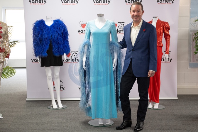 Robert Willis (son of Cilla Black) pose with a 'Jean Varon / John Bates: A maxi dress / evening gown (late 1960)' est (£350 - £550) worn by Cilla Black during a Royal Variety Performance held on, 10th November 1969. at a photocall for 'The Cilla Black Collection' which is to go on auction for Variety, The Children's Charity on Friday 28th November 2025 at Variety House in London, England, UK on Wednesday 5 November, 2025., Credit:Justin Ng / Avalon