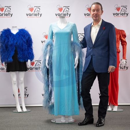 Robert Willis (son of Cilla Black) pose with a 'Jean Varon / John Bates: A maxi dress / evening gown (late 1960)' est (£350 - £550) worn by Cilla Black during a Royal Variety Performance held on, 10th November 1969. at a photocall for 'The Cilla Black Collection' which is to go on auction for Variety, The Children's Charity on Friday 28th November 2025 at Variety House in London, England, UK on Wednesday 5 November, 2025., Credit:Justin Ng / Avalon
