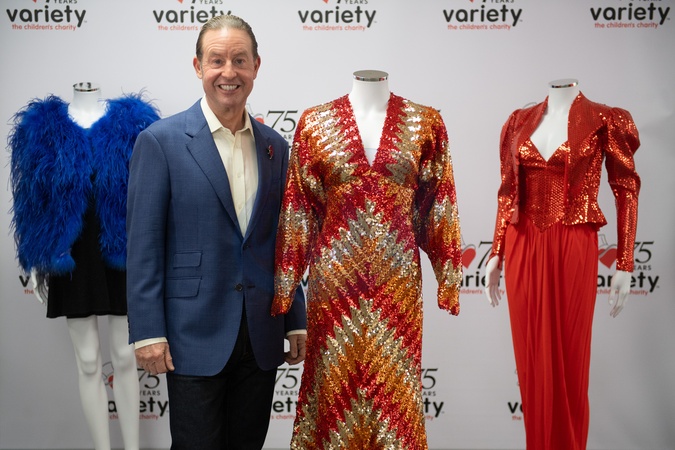 Robert Willis (son of Cilla Black) pose with 'A collection of sequinned stage costumes' (est. £200 - £300) at a photocall for 'The Cilla Black Collection' which is to go on auction for Variety, The Children's Charity on Friday 28th November 2025 at Variety House in London, England, UK on Wednesday 5 November, 2025., Credit:Justin Ng / Avalon