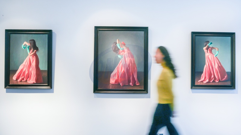 London, UK. 05th Nov, 2025. Staff with, left to right, 'Flow', 'Glitch', 'Silent Disco', all 2025. Alex Russell Flint, painter of 'transgressive glamour', returns for his first solo exhibition in the UK for eight years. The exhibition runs Nov 6-27 at Catto Gallery in Hampstead., Credit:Imageplotter / Avalon
