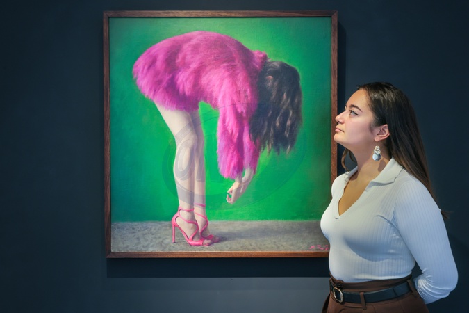 London, UK. 05th Nov, 2025. Staff with 'Ostrich', 2025. Alex Russell Flint, painter of 'transgressive glamour', returns for his first solo exhibition in the UK for eight years. The exhibition runs Nov 6-27 at Catto Gallery in Hampstead., Credit:Imageplotter / Avalon
