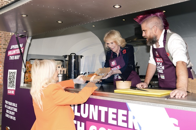 Queen Camilla serves Gaby Roslin with Spudman as he delivers jacket potatoes in a Royal Voluntary Service food truck, as she hosts members of the National Association of Care Catering (NACC), and representatives from Royal Voluntary Service (RVS) in a celebration of community volunteering during Meals on Wheels Week, at Clarence House in central London. Picture date: Wednesday November 5, 2025., Credit:Jordan Pettitt / Avalon