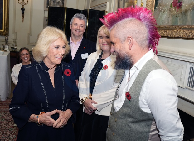 Queen Camilla speaks to Spudman, as she hosts members of the National Association of Care Catering (NACC), and representatives from Royal Voluntary Service (RVS) in a celebration of community volunteering during Meals on Wheels Week, at Clarence House in central London. Picture date: Wednesday November 5, 2025., Credit:Jordan Pettitt / Avalon