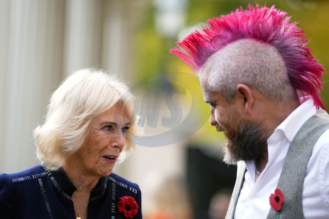 Queen Camilla meets Spudman as he delivers jacket potatoes in a Royal Voluntary Service food truck, as she hosts members of the National Association of Care Catering (NACC), and representatives from Royal Voluntary Service (RVS) in a celebration of community volunteering during Meals on Wheels Week, at Clarence House in central London. Picture date: Wednesday November 5, 2025., Credit:Jordan Pettitt / Avalon