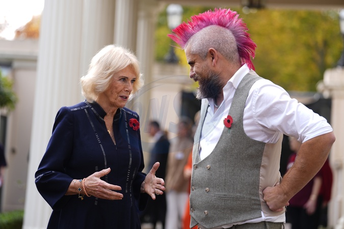 Queen Camilla meets Spudman as he delivers jacket potatoes in a Royal Voluntary Service food truck, as she hosts members of the National Association of Care Catering (NACC), and representatives from Royal Voluntary Service (RVS) in a celebration of community volunteering during Meals on Wheels Week, at Clarence House in central London. Picture date: Wednesday November 5, 2025., Credit:Jordan Pettitt / Avalon