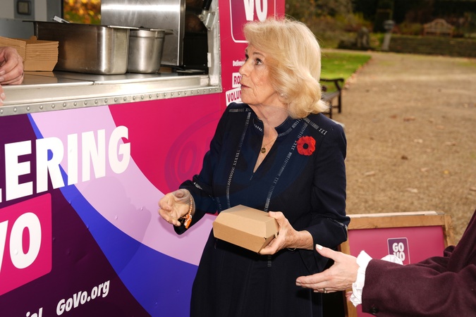 Queen Camilla is served from Spudman as he delivers jacket potatoes in a Royal Voluntary Service food truck, as she hosts members of the National Association of Care Catering (NACC), and representatives from Royal Voluntary Service (RVS) in a celebration of community volunteering during Meals on Wheels Week, at Clarence House in central London. Picture date: Wednesday November 5, 2025., Credit:Jordan Pettitt / Avalon