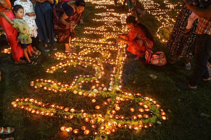 devotees and children pose amid rows of earthen lamps during dev deepawali celebrations at mankameshwar ghat, in lucknow november 5, 2025, Credit:Amit Shukla / Avalon