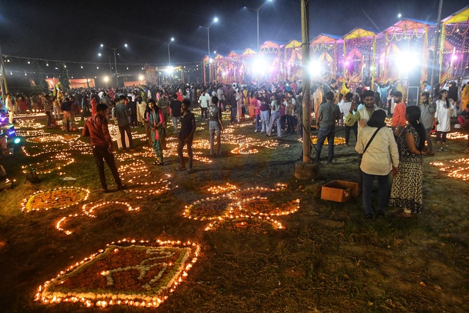 people gather at mankameshwar ghat decked up with thousands of lamps during dev deepawali celebrations , in lucknow, nov 5, 2025, Credit:Amit Shukla / Avalon