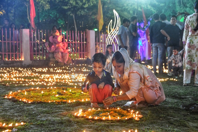 devotees and children pose amid rows of earthen lamps during dev deepawali celebrations at mankameshwar ghat, in lucknow november 5, 2025, Credit:Amit Shukla / Avalon