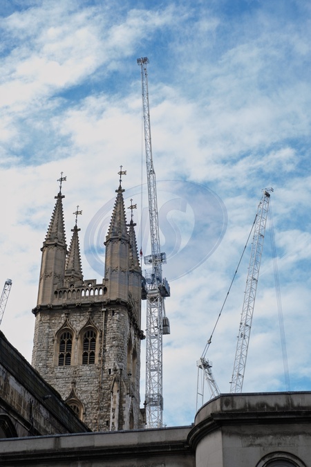 Tower cranes behind the old church of the Holy Sepuchre ( Contains the bell that tolled for the condemed at Newgate prison) by Holborn Viaduct.London, UK.