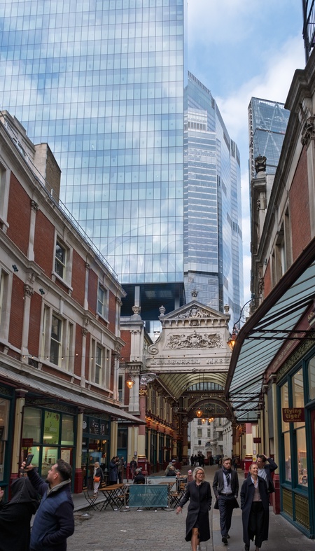 Modern glass skyscrapers contrast with the older Leadenhall market in the City of London. London . United Kingdom. 04 November 2025, Credit:Mark Fairhurst / Avalon