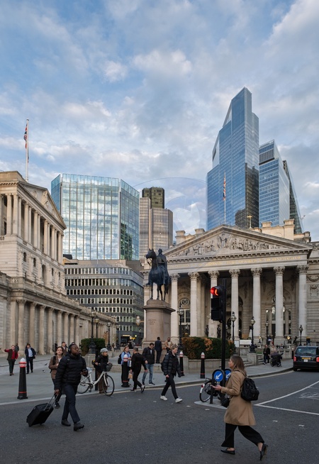 Classic buildings around the Bank junction in the City of London, London, UK.