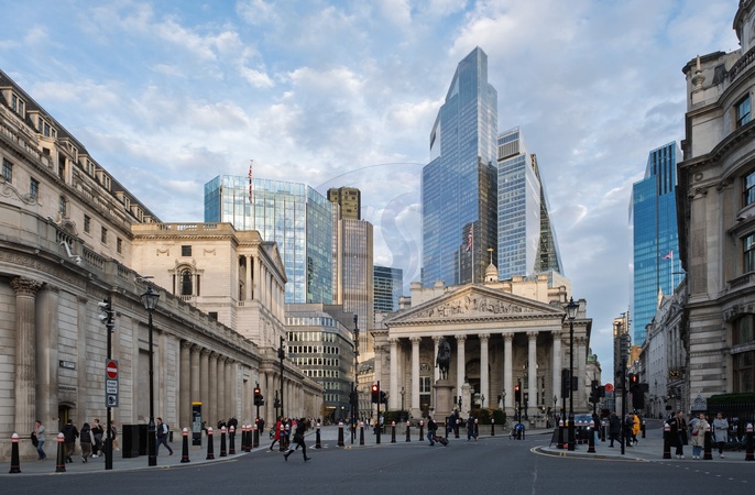 Classic buildings around the Bank junction in the City of London, London, UK.
