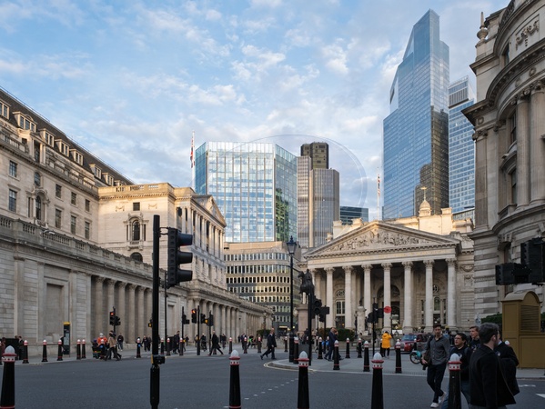 Classic buildings around the Bank junction in the City of London, London, UK.