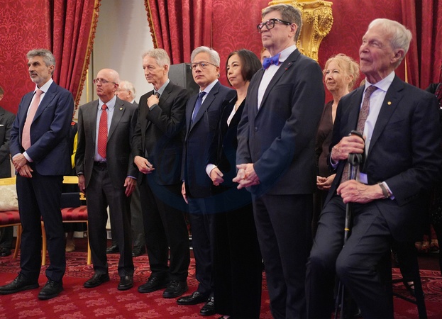 The recipients of the 2025 Queen Elizabeth Prize for Engineering (left-right) Professor Yoshua Bengio, Dr. Bill Dally, Professor Geoffrey Hinton, Jensen Huang, Dr. Fei-Fei Li, Dr. Yann LeCun and Professor John Hopfield, for their contributions to the development of modern machine learning in the field of Artificial Intelligence, during a reception at St James' Palace in central London. The Queen Elizabeth Prize for Engineering (QEPrize) champions engineering innovation which is of global benefit to humanity. Picture date: Wednesday November 5, 2025., Credit:Yui Mok / Avalon