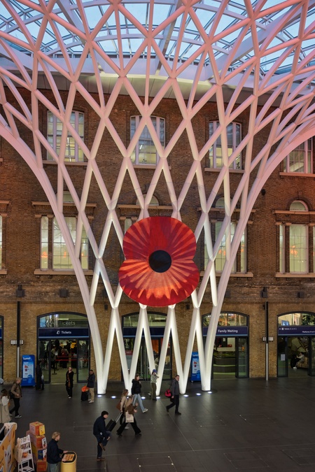 Huge poppy on display for Remembrance in Kings Cross station. London . United Kingdom. 04 November 2025, Credit:Mark Fairhurst / Avalon