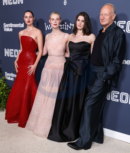LOS ANGELES, CALIFORNIA, USA - NOVEMBER 05: Norwegian actress Renate Reinsve wearing a Schiaparelli FW25 Couture gown, American actress and singer Elle Fanning wearing a Fendi Couture dress and Cartier jewelry, Norwegian actress Inga Ibsdotter Lilleaas and Swedish actor Stellan Skarsgard (Stellan Skarsgård) arrive at the Los Angeles Premiere Of Neon's 'Sentimental Value' held at the DGA Theater Complex at The Directors Guild of America on November 5, 2025 in Los Angeles, California, United States., Credit:Xavier Collin / Avalon