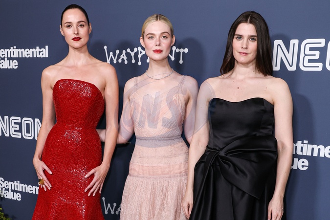 LOS ANGELES, CALIFORNIA, USA - NOVEMBER 05: Norwegian actress Renate Reinsve wearing a Schiaparelli FW25 Couture gown, American actress and singer Elle Fanning wearing a Fendi Couture dress and Cartier jewelry and Norwegian actress Inga Ibsdotter Lilleaas arrive at the Los Angeles Premiere Of Neon's 'Sentimental Value' held at the DGA Theater Complex at The Directors Guild of America on November 5, 2025 in Los Angeles, California, United States., Credit:Xavier Collin / Avalon