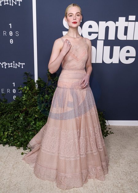 LOS ANGELES, CALIFORNIA, USA - NOVEMBER 05: American actress and singer Elle Fanning wearing a Fendi Couture dress and Cartier jewelry arrives at the Los Angeles Premiere Of Neon's 'Sentimental Value' held at the DGA Theater Complex at The Directors Guild of America on November 5, 2025 in Los Angeles, California, United States., Credit:Xavier Collin / Avalon