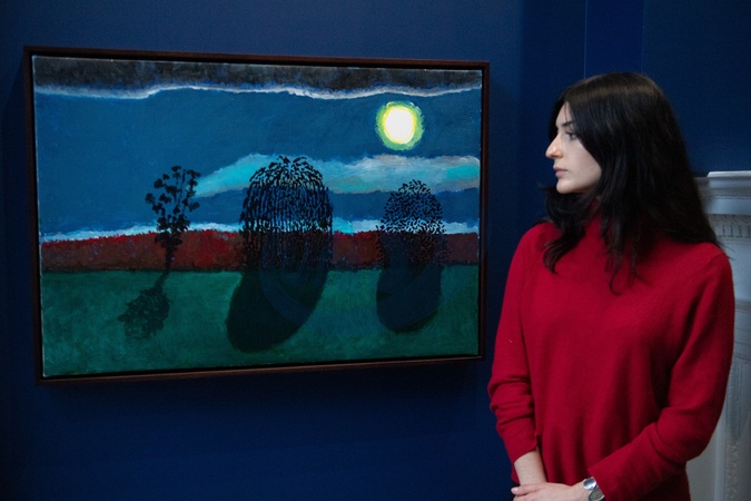 A staff member views 'The Moon, August 9th 2023' by David Hockney as part of The 'David Hockney - Some Very, Very, Very New Paintings not yet Shown in Paris Press View' at Annely Juda Fine Art in London, England, UK on Thursday 06 November, 2025., Credit:Justin Ng / Avalon