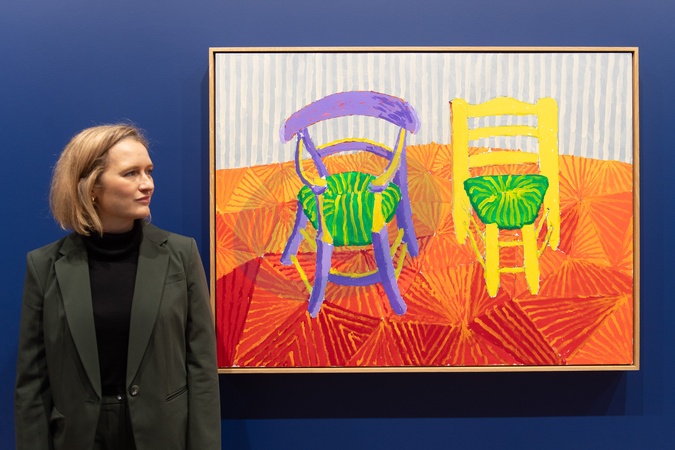 A staff member views 'Gauguin's Chair and Vincent's Chair, July 2025' by David Hockney as part of The 'David Hockney - Some Very, Very, Very New Paintings not yet Shown in Paris Press View' at Annely Juda Fine Art in London, England, UK on Thursday 06 November, 2025., Credit:Justin Ng / Avalon
