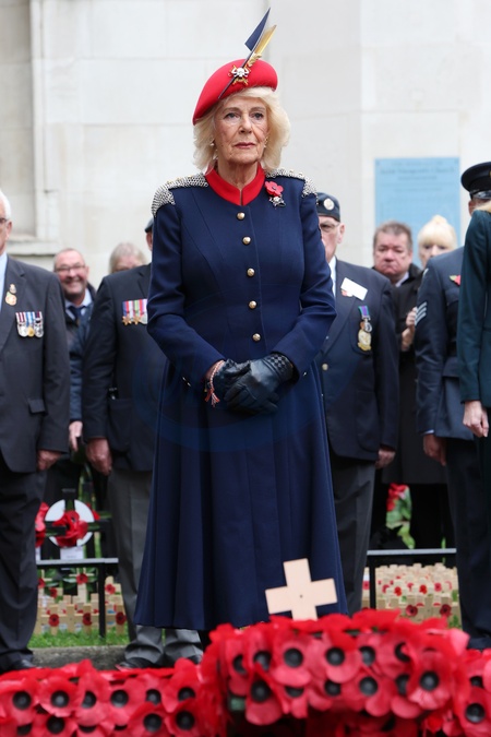 Queen Camilla stands in front of the cross of remembrance during a visit to the 97th Field Of Remembrance at Westminster Abbey on November 06, 2025 in London, England. The Field of Remembrance has been held every November since 1928 when The Poppy Factory, of which Queen Camilla is Patron, brought a group of disabled veterans, a tray of poppies and a collecting tin to the grounds of St Margaret's Church at Westminster Abbey., Credit:Avalon.red / Avalon